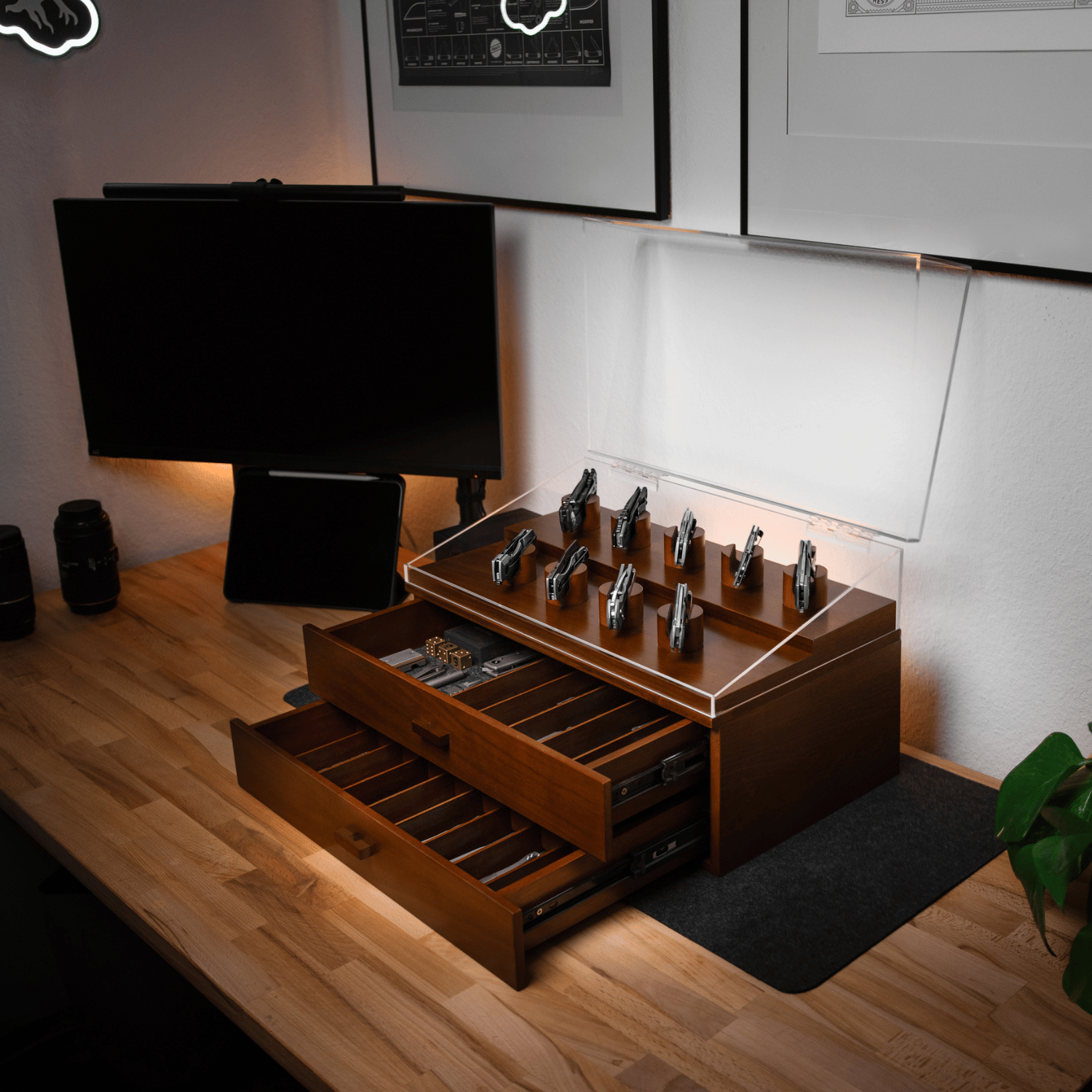 - Display your 9 favorite knives on the felt lined pillars + extra 30-40 in the drawers