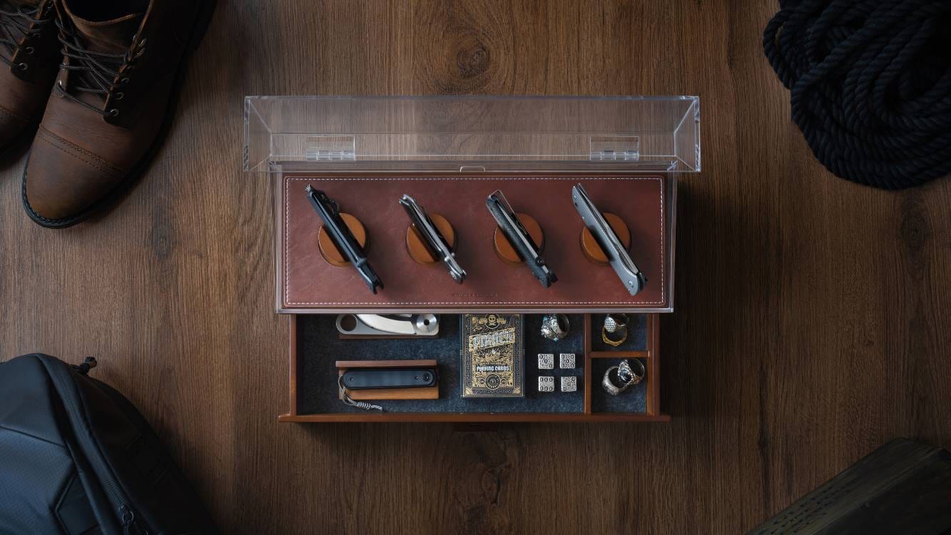 The Knife Deck Pro is the ultimate compact display case for those who take pride in their knives. Designed to keep your 4 favorite knives on full display while storing up to 6 more in the drawer, it ensures your collection stays organized, protected, and always within reach.